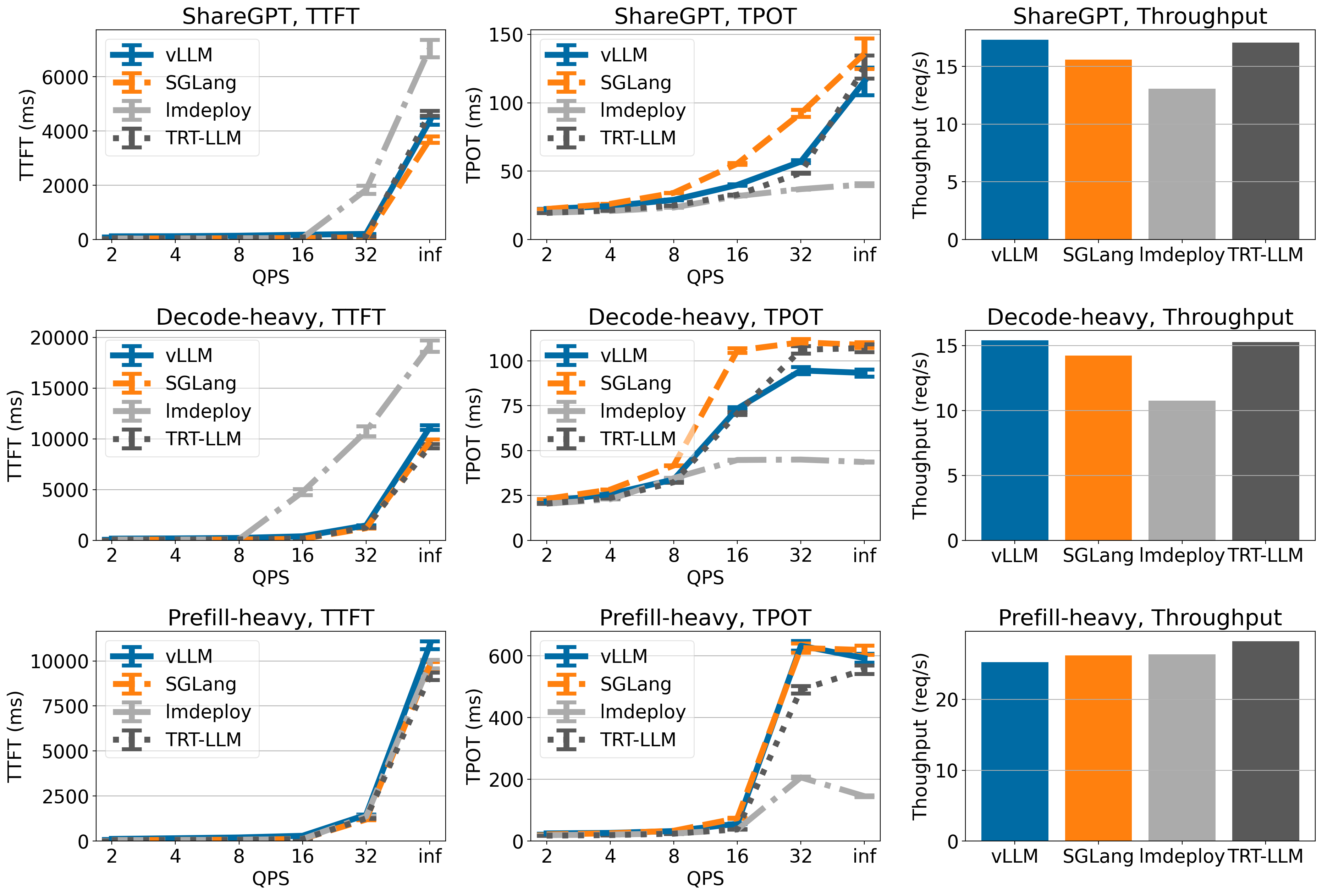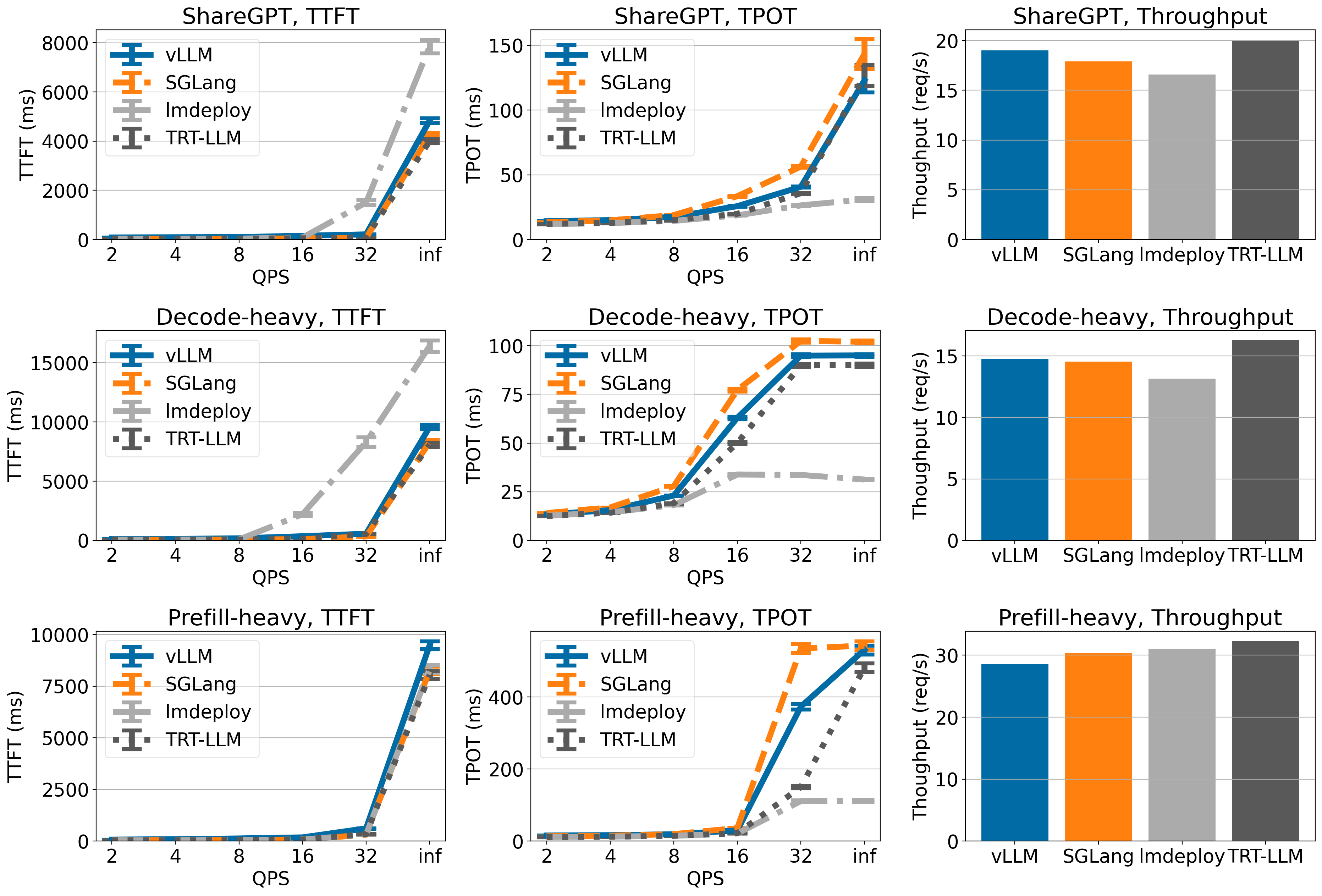 For the rest of performance benchmarks, as well as captured detailed metrics for time-to-first-token (TTFT) and time-per-output-token (TPOT), please refer to the appendix for more data and analysis. You can follow this github issue to reproduce our benchmark.
