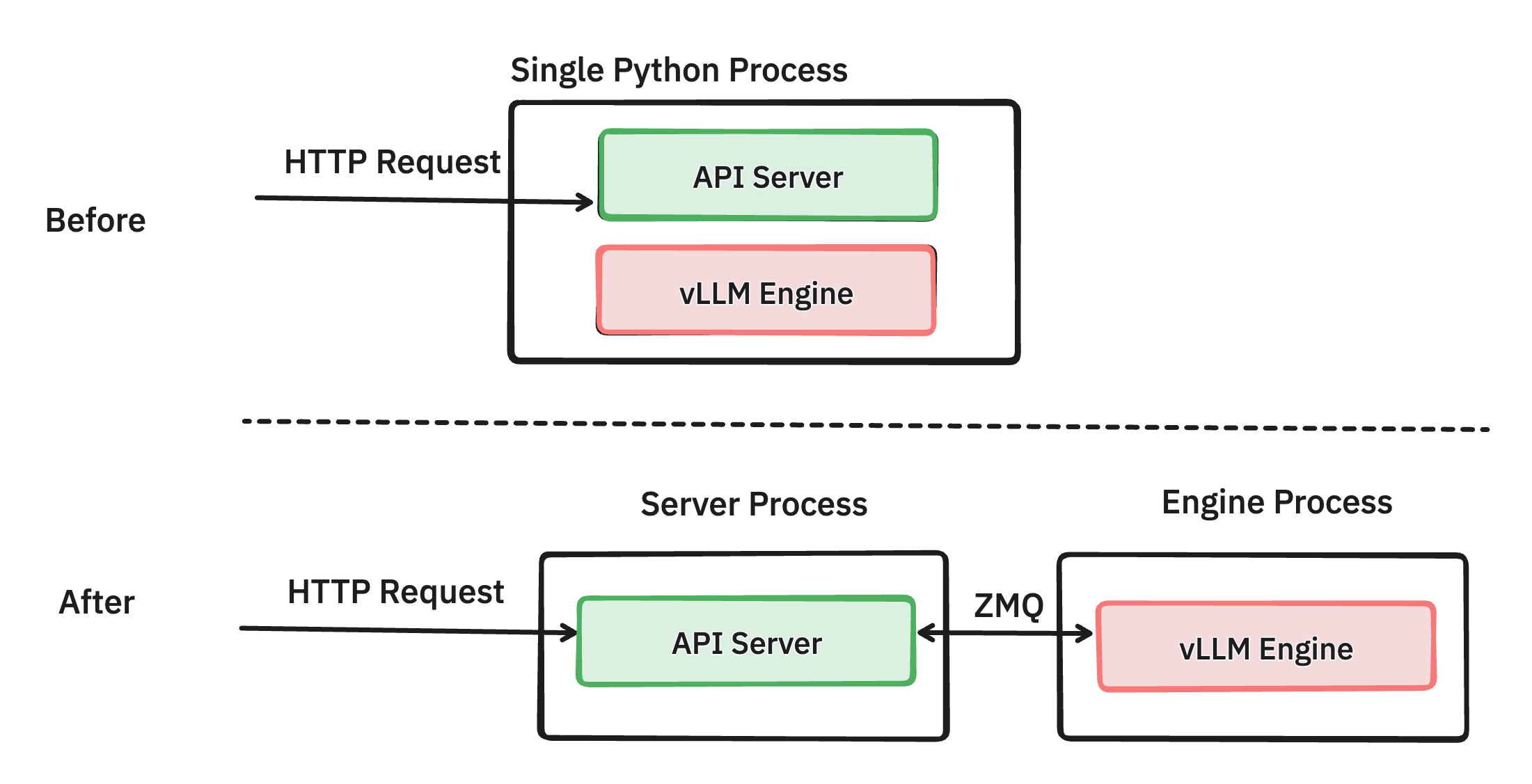 Illustration of the serving process architecture before and after. We separated the http serving component from the vLLM engine, and connected them with a ZMQ socket. This architecture ensures both CPU heavy components are isolated from each other.