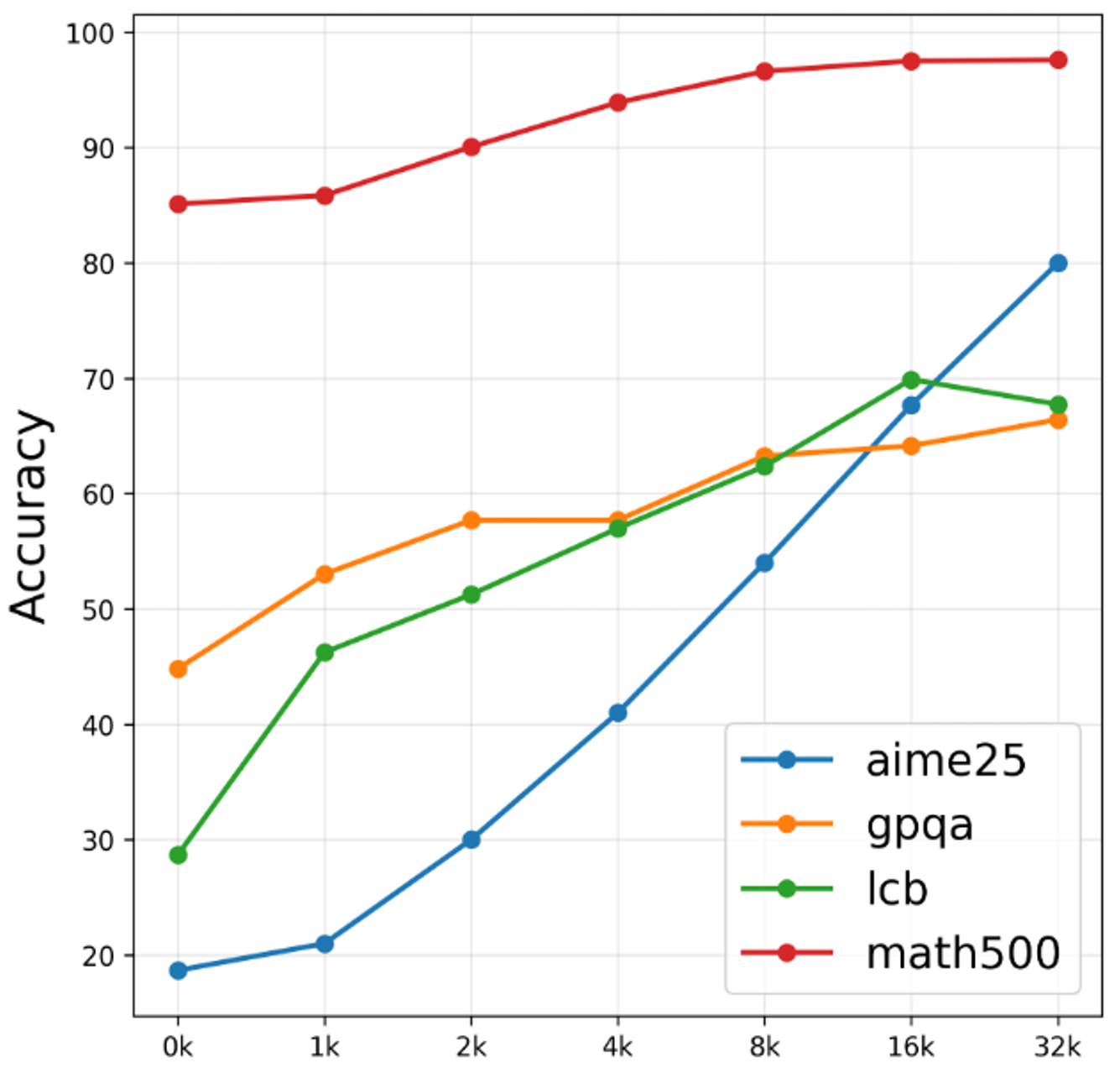 Figure 2: Chart showing the accuracy of Nemotron Nano 2 9B model on popular benchmarks at various “Token Budget” thresholds